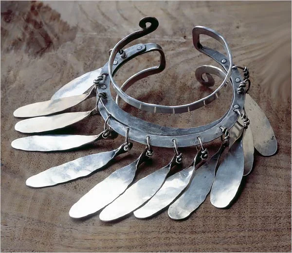 At the entrance of Alexander Calder’s jewelry exhibition at the Metropolitan Museum of Art is “the Jealous Husband” Necklace. A seemingly witty reference to chastity belts, the piece sports spikes across the neck opening to stave away potential suitors. This necklace encapsulates the spirit of Calder’s jewelry, which appears witty and whimsical yet, at times, reads as constricting. Suggestions of boundedness and containment seem to transpire in some of the pieces—particularly a number of chocker-style necklaces. These are overlaid with Surrealist influences, as well as references to medieval and non-Western jewelry traditions.